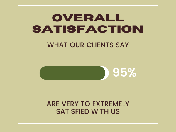 Our clients measured their satisfaction with us using a scale of 1 (not satisfied) to 5 (extremely satisfied). We scored a 4.74 or 95%!